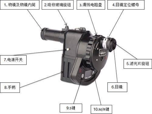 2. 瞄準被測物體,接通電源,使用S鍵(量程鍵)切換量程,根據吸收玻璃旋鈕2的指向進行選擇。